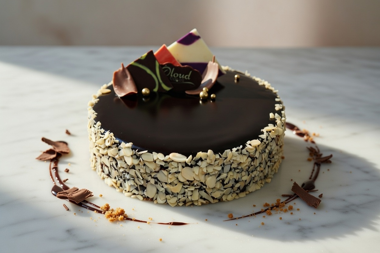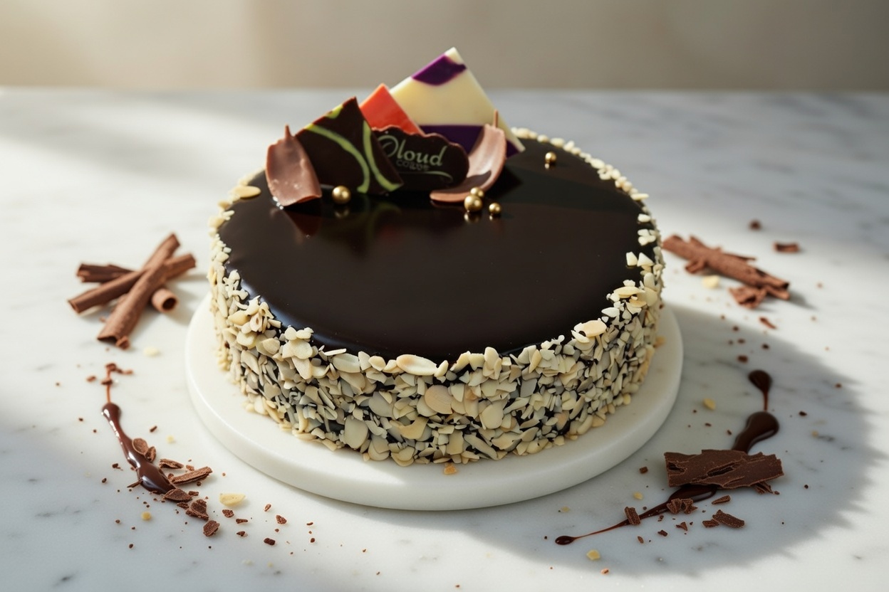Soft chocolate cake layered with creamy chocolate frosting and crunchy roasted almonds for a perfect balance of texture and flavor.
