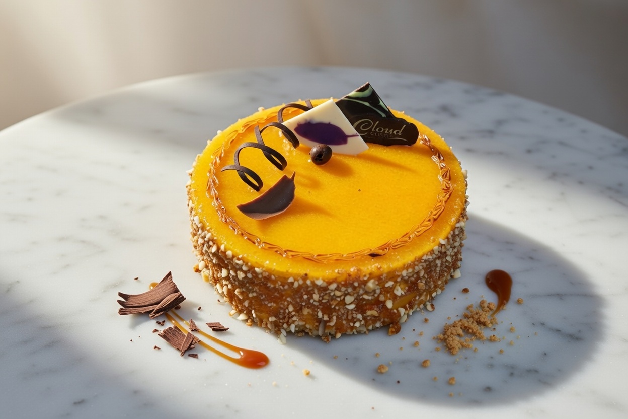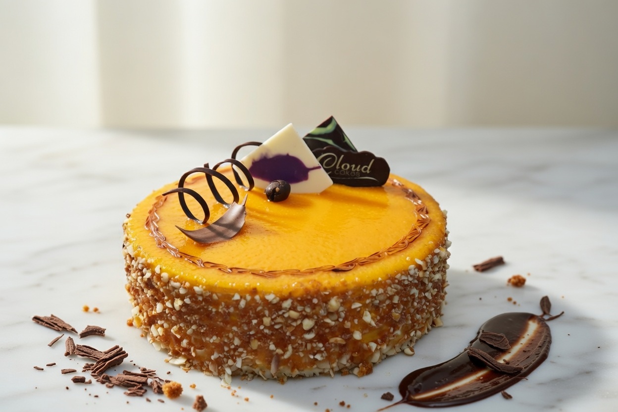 Fresh mango-flavored cake layered with crunchy praline pieces and smooth cream for a unique tropical dessert.