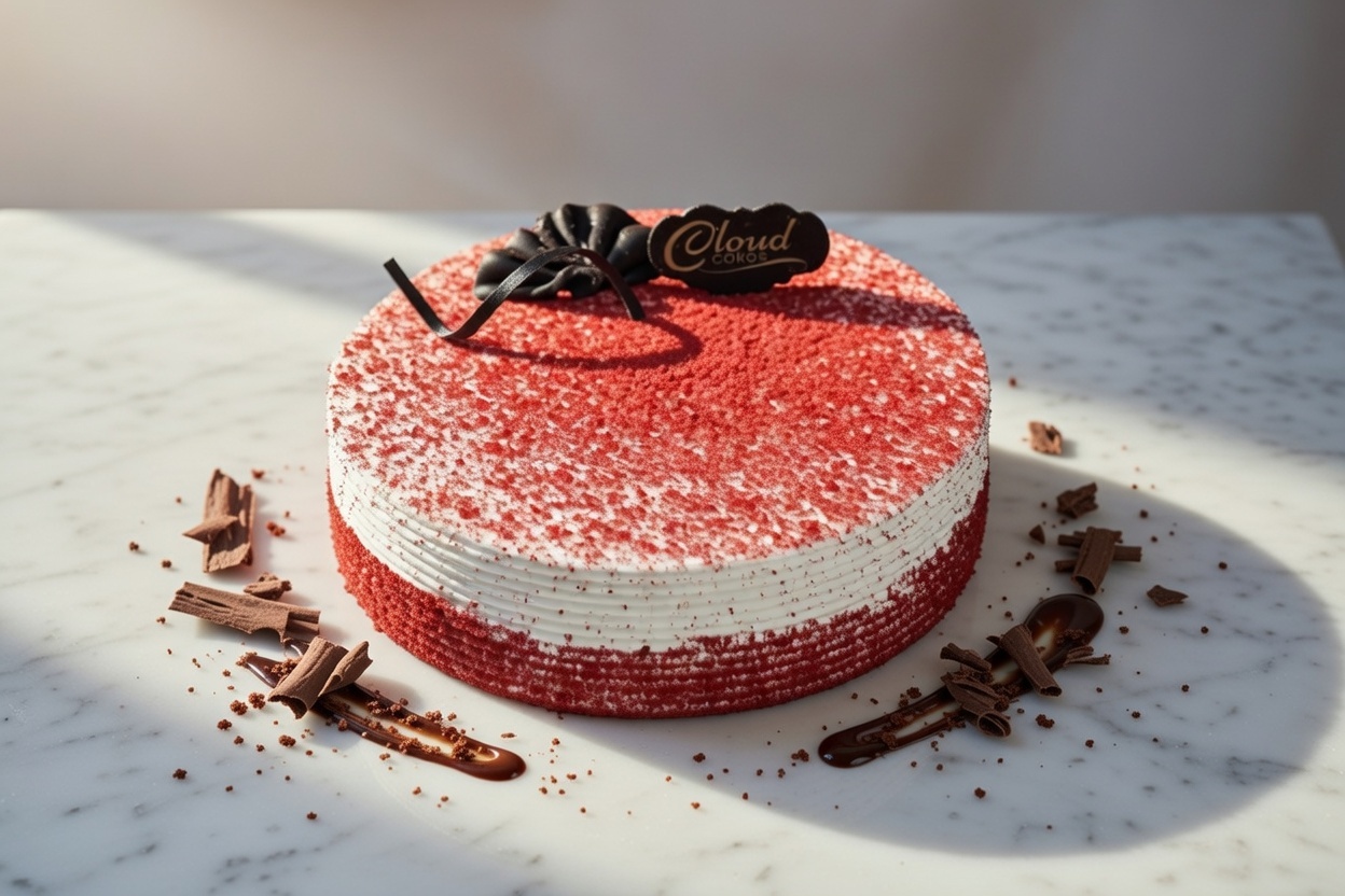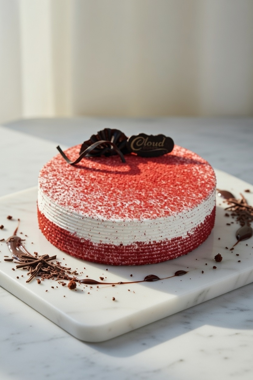 Classic red velvet sponge layered with smooth cream cheese-style frosting for a rich and elegant dessert.